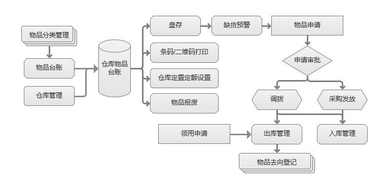 采购与供应链管理包含:供应商管理、物资管理、库存管理、物资领用管理、采购申请管理、采购过程管控等部分功能,实现物资申请管理、采购管理、出库管理、入库管理、仓库调拨管理、仓库盘存管理,满足企业物资、办公用品、固定资产等物资、资产设备采购管理。