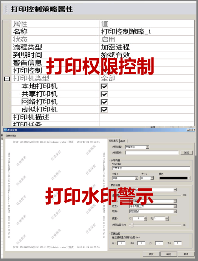 公司的设计图纸、创意成果、招投标文件、大客户信息等机密文件被员工随意地打印外带,打印操作不受控制; 打印信息无任何的日志记录,不便于事后审计和追踪; 一旦发生打印泄密事件,无法通过技术手段来进行溯源和追责; 无打印水印警示,事后无法追究泄密人员的相关法律责任。